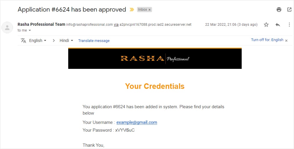 3. Once your application is approved by Rasha, you will get a username and password on your registered email id.