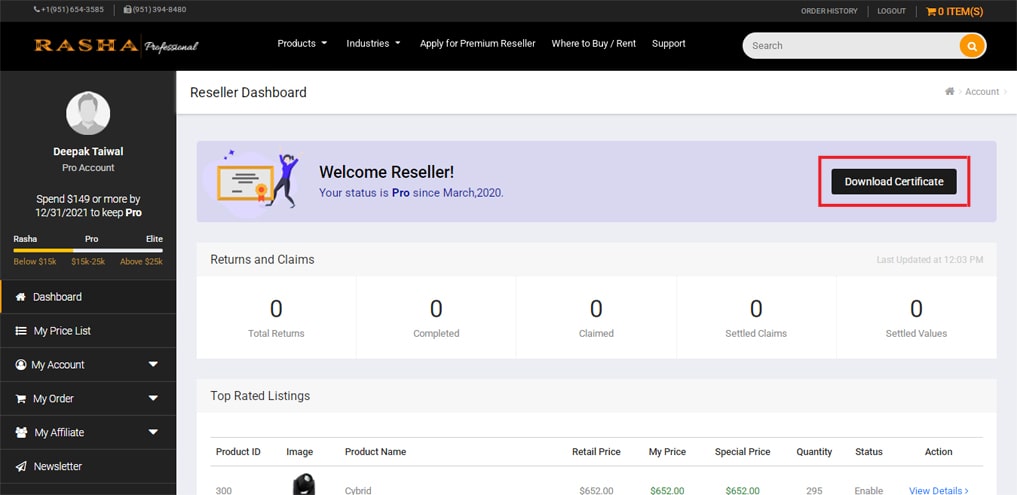 1. On the reseller dashboard, you can check the special price list and download the certificate.